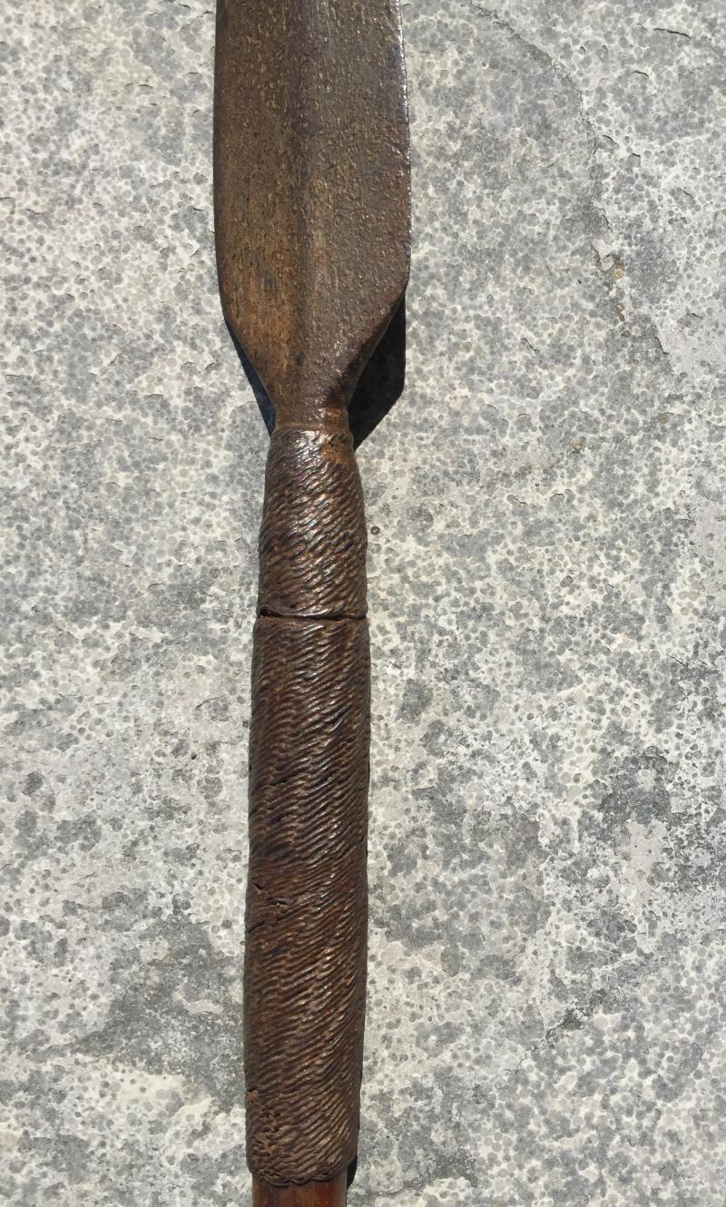 Original close combat stabbing spear with iron/steel binding. The overall length of the spear is 40.5 inches ( 105 cm) and the blade is long measuring 14.5 x 1.65 inches (37 x 4.2 cm). the surfaces of the blade and binding are rusted. See photos